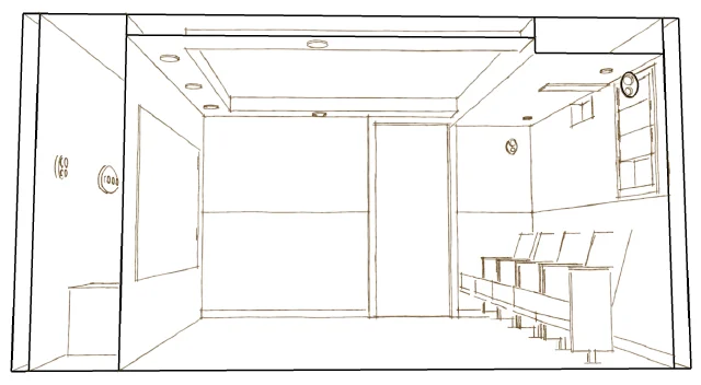 In the back, as you can see from the above photo, are the projector and A/V equipment. The overhead lighting from the soffitting helps to add a diffuse glow to the room.